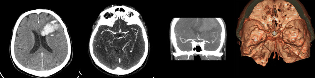 Pentru evaluarea pacienților cu AVC acut, angiografia CT este o metodă rapidă și acurată, informațiile relevante în ceea ce privește atât calibrul și permeabilitatea vasculară, cât și perfuzia parenchimatoasă fiind obținute la prima trecere a substanței de contrast aplicată în bolus.