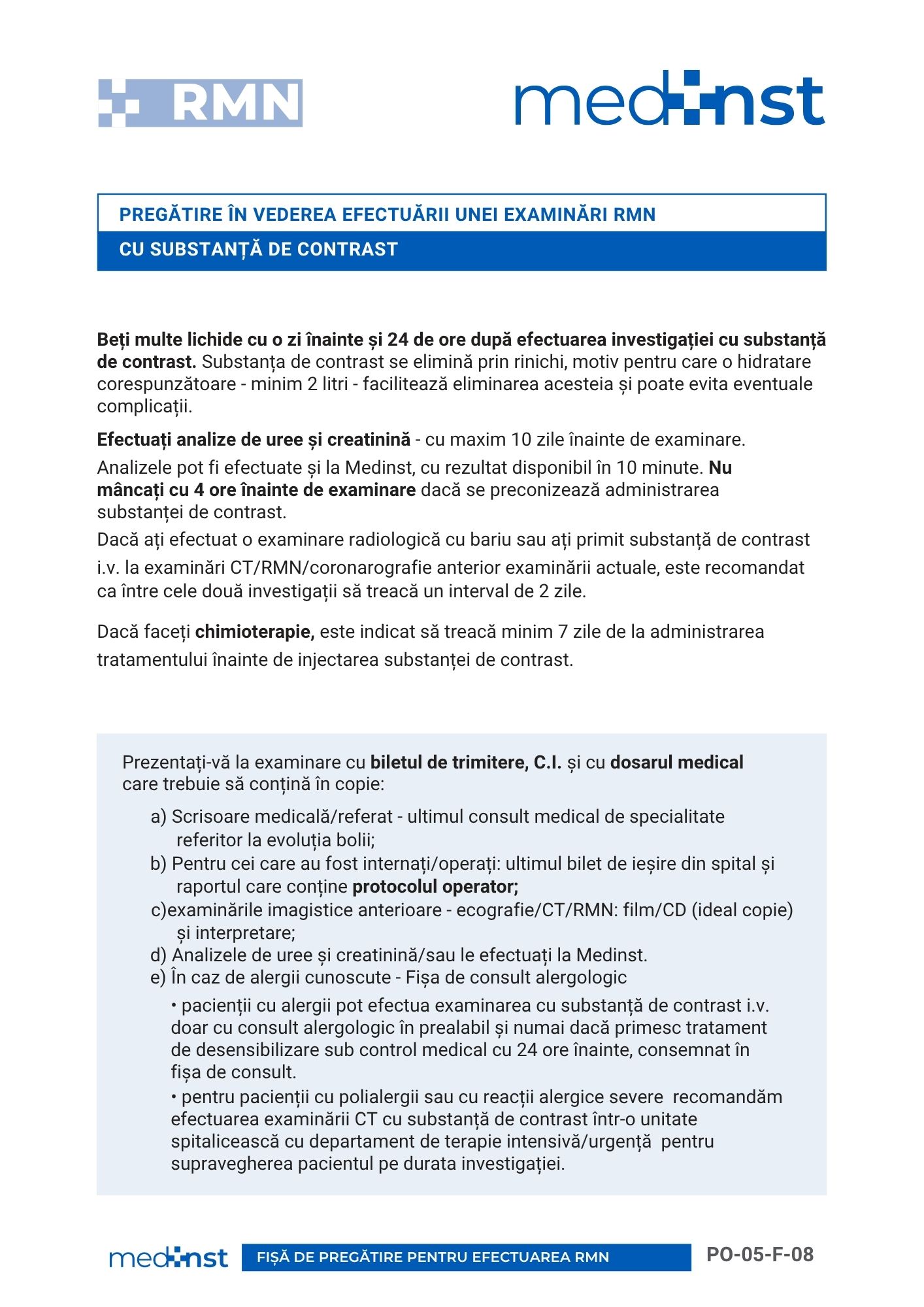 Fiecare ghid de pregătire conține și o listă cu documentele medicale necesare pentru stabilirea protocoalelor de examinare dedicate situației/afecțiunii dumnevoastră medicale.